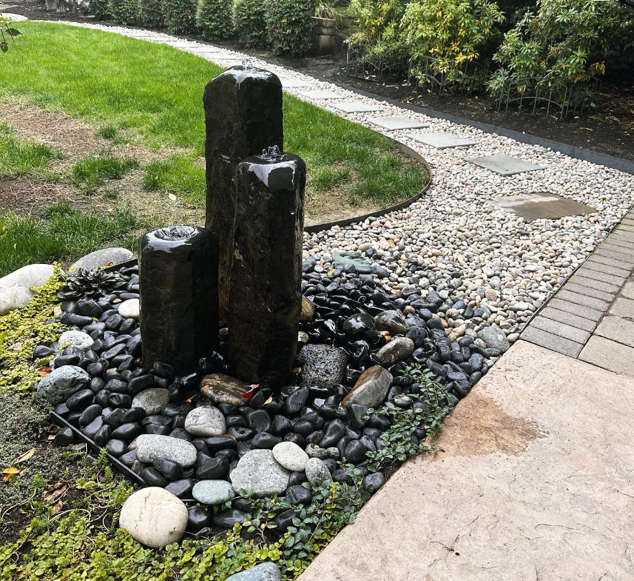 Front Yards, Back yards, Side yards, design and installation of plantings, mulch, steel edging.