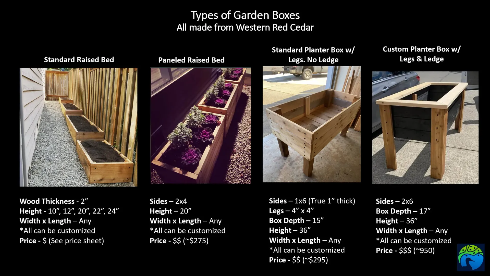 My boxes are also sold through ThewormfarmPortland (www.thewormfarmportland.com) located out near Newberg. He also sells high quality OMRI certified organic soil meant for the discerning individual who want better yields and bountiful harvests. Look, it's fine with me if you want to grow some puny tomatoes in these nice boxes. That's your business. But wherever you buy your soil, keep in mind it's the soil, not the box that'll grow the plants and vegetables.