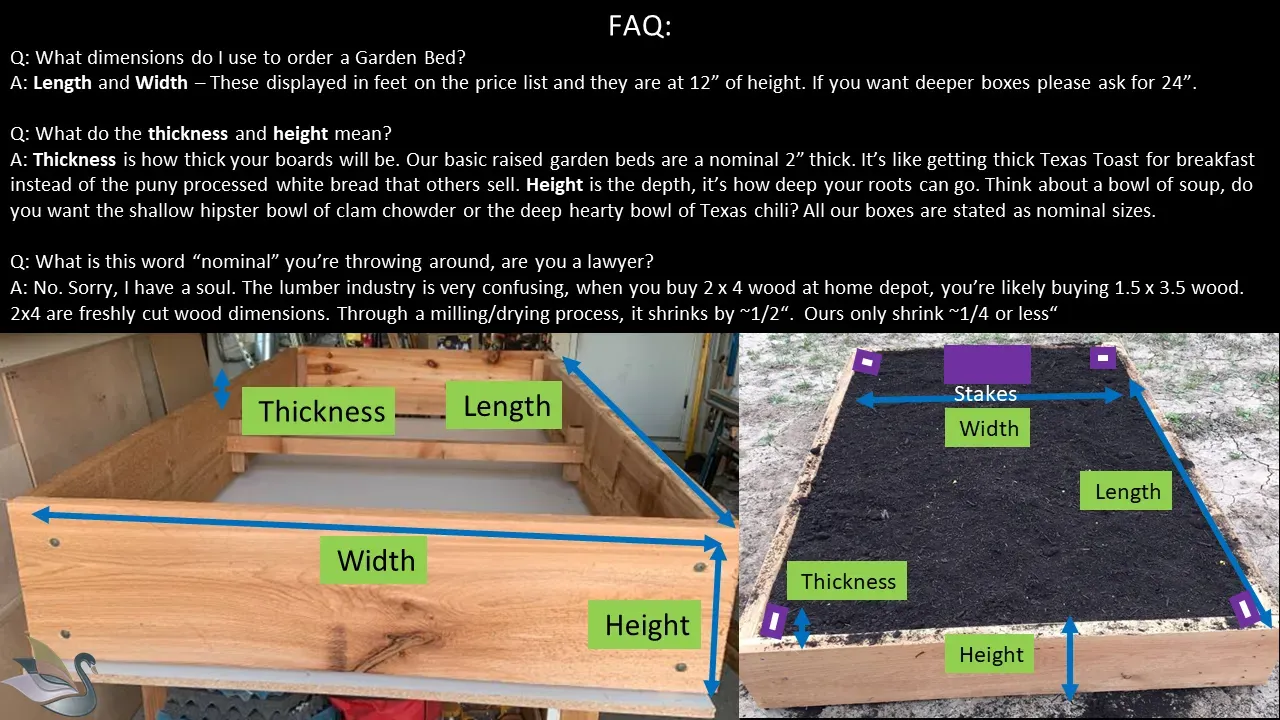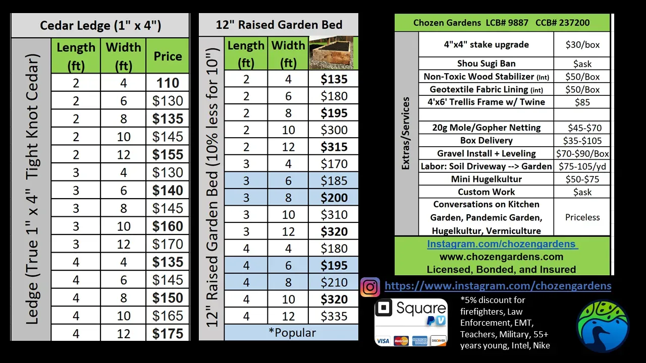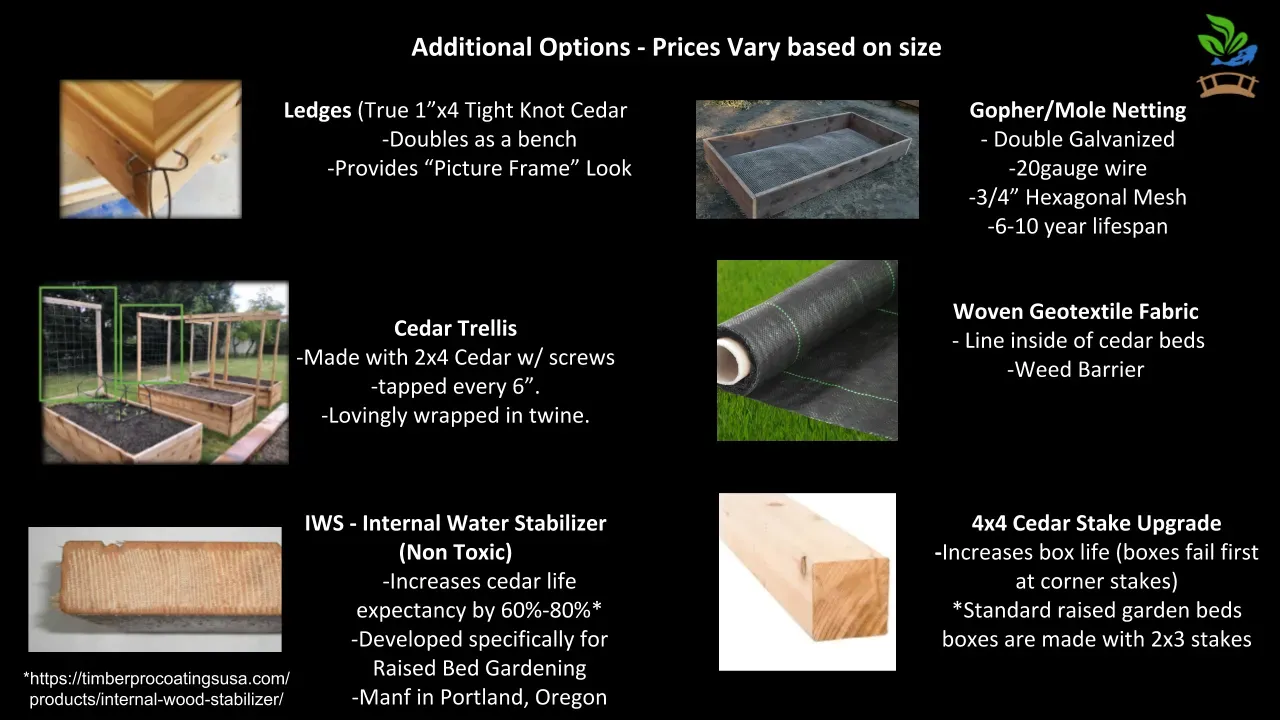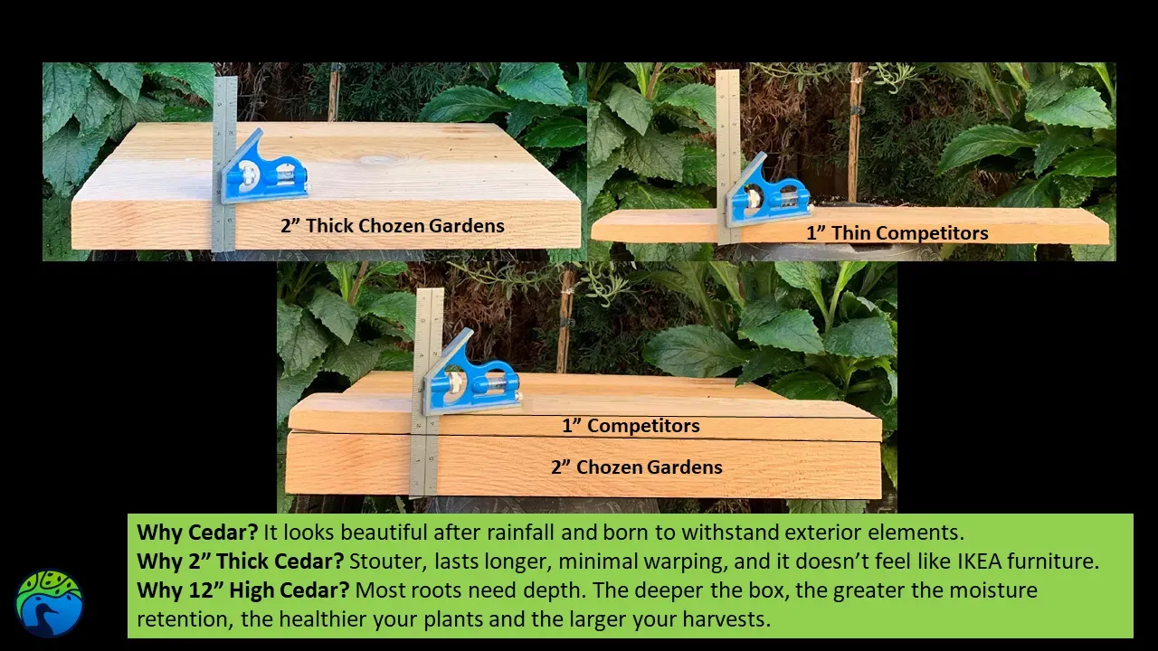 Tough and rugged 2"x 12" cedar garden beds with unmatched quality. Remember these are 2" thick (most are 1") and 12" tall (most are 10"), held together at the corners with meaty 2"x3" thick stakes, reinforced by quality structural lag screws (these screws are used on Retaining Walls!), and built with 100% untreated western red cedar. I also reinforce the boxes in the middle with a beam to connect both sides in order to prevent outward bowing during the changing of the seasons.