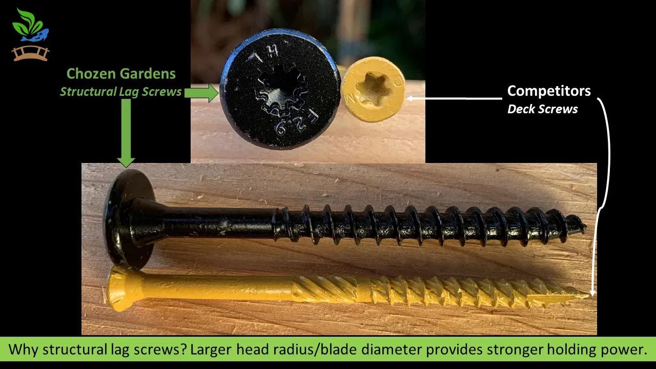 Most people underestimate the size of these cedar boxes and the fat screws I use to clamp the corners. The threads on these screws are like razorblades that'll pierce and hold the cedar planks together. Additionally these have "washer heads" which are large in diameter to push the wood together. Those dinky decking screws won't cut it, they're far smaller in diameter and sink through the box, my heavy duty screws securely clamp the box together.